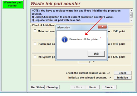 5.当提示[plese turn off the printer] 时,请先关闭打印机,然后点击[确定],接着点[确定]重开打印机。如图。