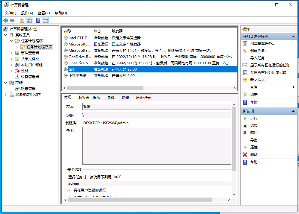在计算机管理→系统工具→任务计划程序→创建基本任务。按照想要的备份周期新建一个计划任务运行上面生成的批处理作业 文件:FreeFileSync v11.27.7z